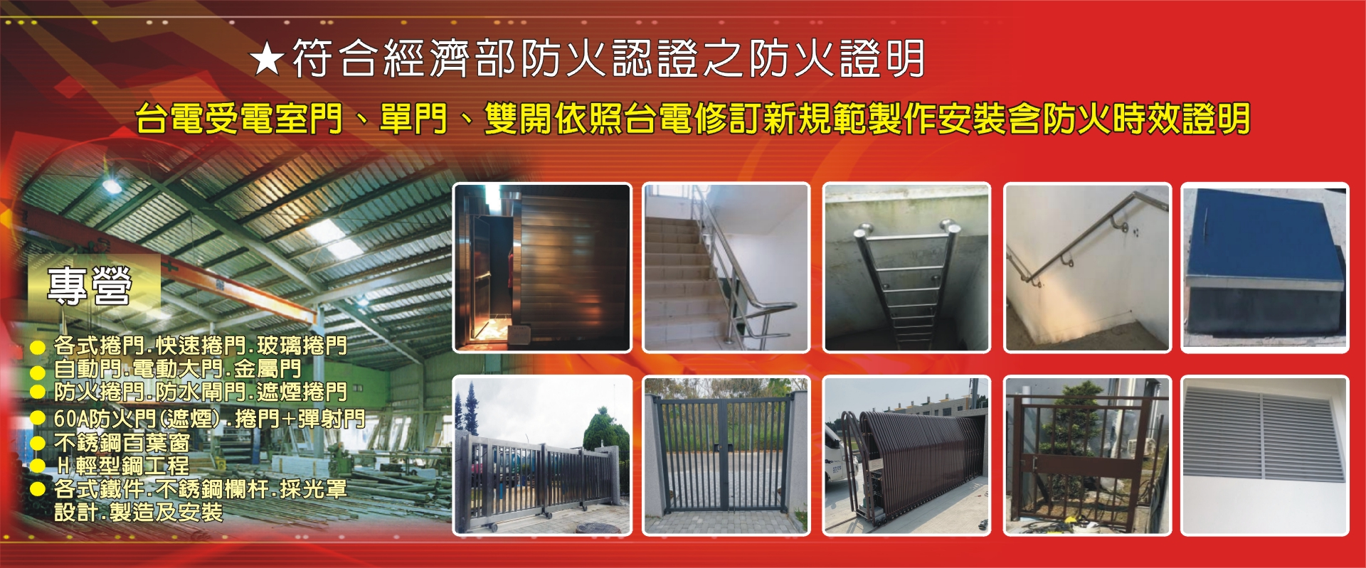 專營:各式捲門,防火區劃捲門、防火門,電動大門、不銹鋼門窗、採光罩、自動門、不銹鋼藝術造型、各式鐵件、阻熱性防火布捲門、60A阻熱性捲門等~歡迎來電洽詢